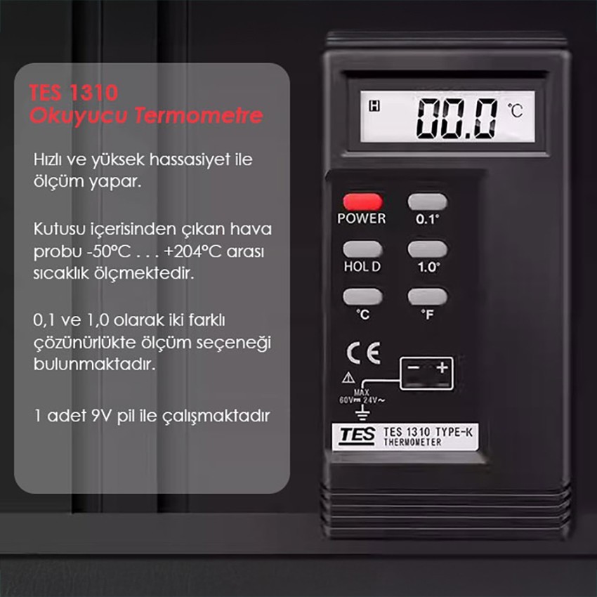 TES 1310 K tipi prob okuyucu, k tipi termokupl problar için geliştirilmiş, yüksek hassasiyette sıcaklık ölçümü yapabilen bir cihazdır. Opsiyonel olarak bağlanabilecek farklı problarla 1300°C'ye kadar sıcaklık ölçümü yapılabilir. Kompakt ve taşınabilir yapısı sayesinde endüstriyel ve laboratuvar uygulamaları için idealdir.