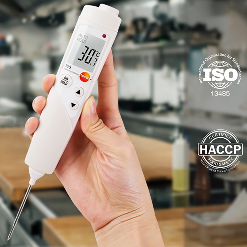 - Testo 106 seti gıda termometresinin yanında gelen TopSafe koruma kılıfı ile kullanıldığında Haccp uyumlu ve EN 13485 sertifikalı'dır.