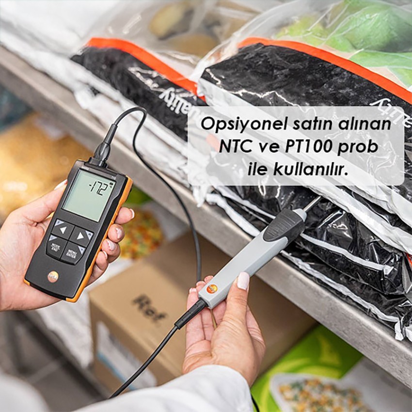 Testo 110 prob okuyucu, NTC ve PT100 problarını kullanarak yüksek hassasiyetli sıcaklık ölçümleri yapabilen bir cihazdır. NTC ve PT100 prob uyumlu olan bu cihaz, özellikle gıda sektöründe ve laboratuvar ortamlarında sıcaklık ölçümleri için uygundur. HACCP uyumlu sıcaklık ölçüm cihazı olarak, EN 13485 sertifikası ile de güvenilirliği onaylanmıştır.