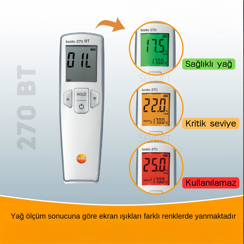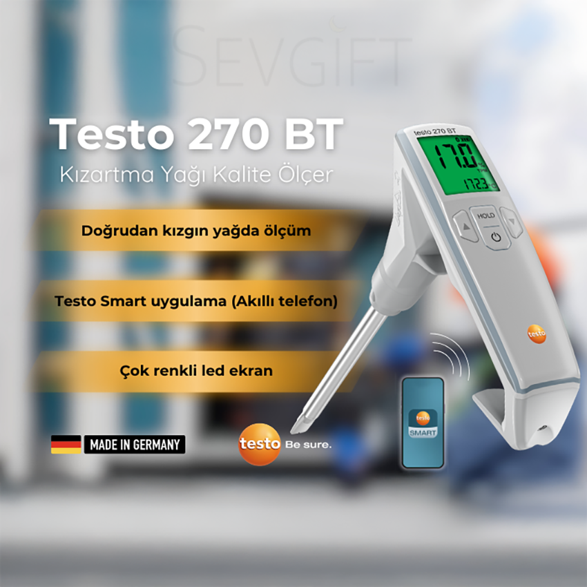 Testo 270 BT kızartma yağı test cihazı; ölçümü yapılan kızartma yağ kalitesinin daha kolay, hızlı ve güvenilir bir şekilde izlenmesini sağlayan ölçüm cihazıdır. Yeni Testo 270 BT ile kızartma süreçlerinizi optimize edip yağ tüketiminizi azaltırken, yüksek ürün kalitenizi izlemek ve sürdürmek artık eskiye göre çok daha kolay hale gelmektedir. Ayrıca Testo Smart App yani akıllı telefon uygulama bağlantısı sayesinde bu yeni versiyon cihaz, kızartma yağınızın TPM (Toplam Polar Madde) değerlerini daha iyi kontrol etmenize olanak tanır ve tüm ilgili verileri doğrudan mobil cihazınızda görüntülemenize ve analiz etmenize imkan tanır.