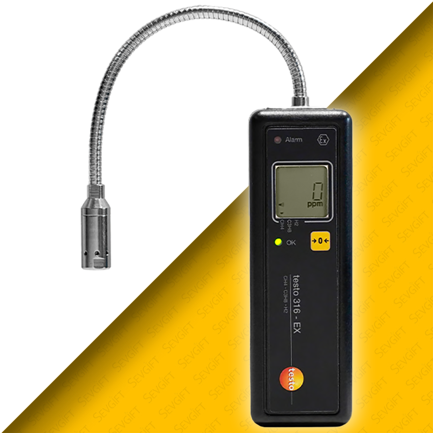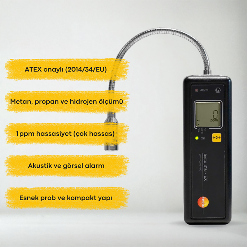 - Tehlikeli ortamlarda güvenli, hızlı ve çok hassas gaz kaçak tespiti için geliştirilmiş olan Testo 316-EX, ATEX onaylı yapısı sayesinde patlayıcı gaz atmosferlerinde dahi güvenle kullanılabilen profesyonel bir ölçüm cihazıdır.