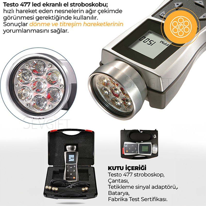 - Ürünün kutu içeriği; Testo 477 stroboskop, Çantası, Tetikleme sinyal adaptörü, Batarya, Fabrika Test Sertifikası.