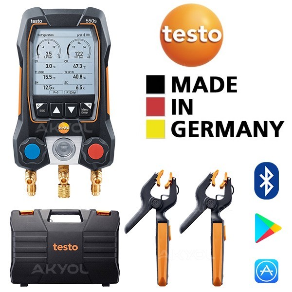 Testo 550s akıllı dijital manifold seti; klima sistemleri, soğutma sistemleri, ısı pompalarının devreye alınması vb. alanlarda bakım, onarım ve kontrol işlemleri için kullanılan 2 yollu valf bloğuna sahip Bluetootlu bir ölçüm cihazıdır.