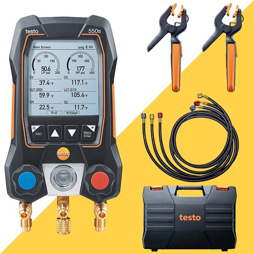 Testo 550s akıllı dijital manifold seti; klima sistemleri, soğutma sistemleri, ısı pompalarının devreye alınması vb. alanlarda bakım, onarım ve kontrol işlemleri için kullanılan 2 yollu valf bloğuna sahip Bluetootlu bir ölçüm cihazıdır.