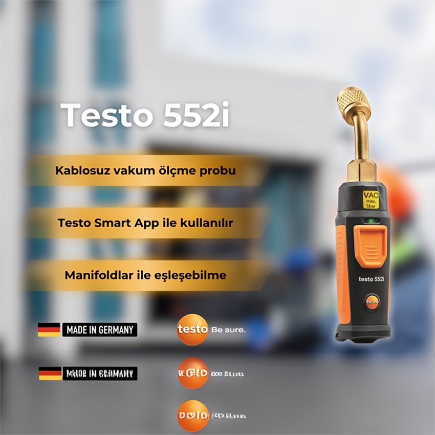Testo 552i uygulama kontrollü kablosuz vakum probu; vakum ölçümünü kablosuz ve hortumsuz olarak ve tek bir servis portu üzerinden, akıllı telefonunuz üzerindeki Testo Smart App uygulaması ile yapabilen ölçüm cihazıdır.