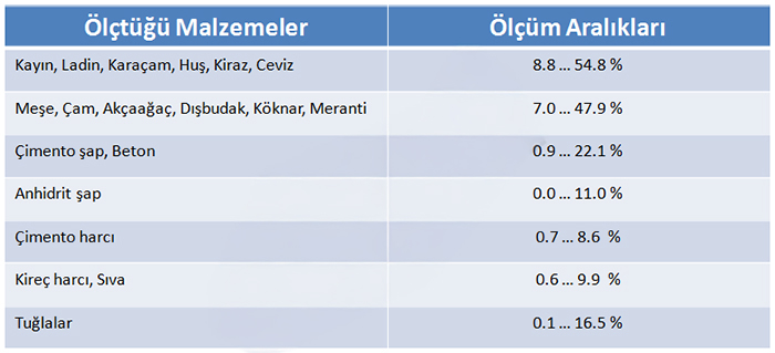 Yumuşak Ahşap, Sert Ahşap, Parçacık Panosu, Anhidrit Sıva, Çimento Sıva, Kireç Briket, Gaz Betonu, Beton, Yüksek Yalıtım Tuğlaları, Katı Tuğlalar gibi malzemelerin nemini profesyonel ve hassas bir şekilde ölçen cihazdır.