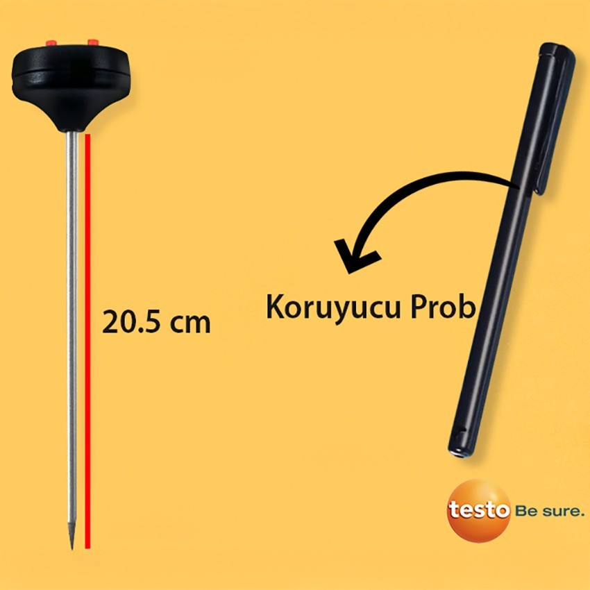 Testo üstten göstermeli mini termometre; 20.5 cm prob uzunluğuna sahip dijital bir sıcaklık ölçüm cihazıdır. Paslanmaz çelik proba sahip olan bu termometre cihazını, sıvılarda ve yarı katı gıdalarda kolay bir şekilde kullanabilirsiniz.