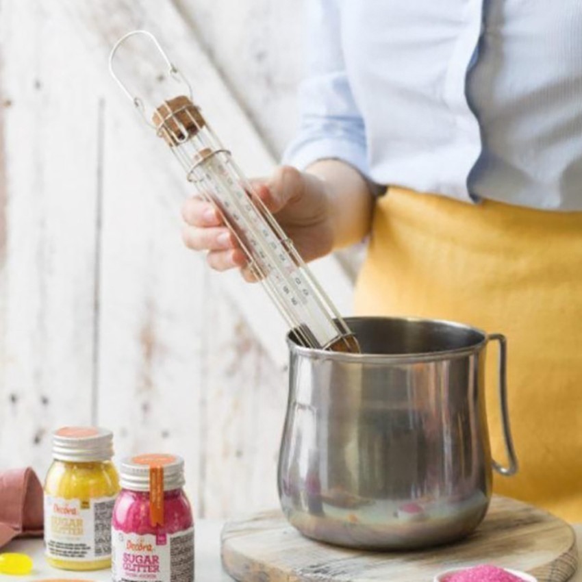 Şeker termometresi, lezzetli şekerlemeler ve tatlılar hazırlarken vazgeçilmezdir. Yüksek kaliteli camdan üretilen iç bölümü, kolay temizlenebilir ve hijyenik bir kullanım sağlar. Termometrenin üst ve alt kısmındaki doğal mantar malzemeler, sıvı içinde dik durmasını ve yüzmesini sağlar. Bu da daha güvenli ve pratik bir kullanım sunar.