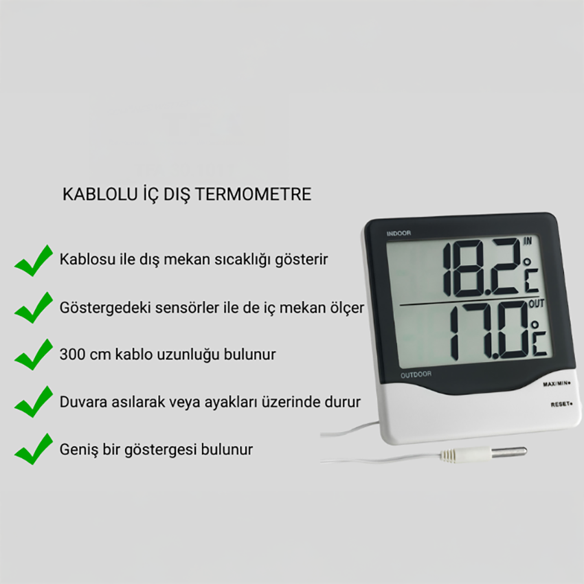 Tfa 30.1011 elektronik iç dış sıcaklık ölçer; hem bulunduğu yerin dijital olarak sıcaklığını gösterir, hem de kablonun ucundaki metal sensörün sıcaklığını gösterir.