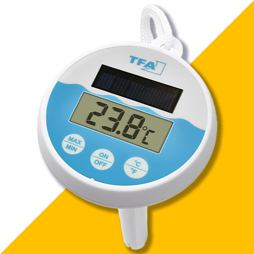 Tfa 40.2005 ibreli havuz termometresi cihazı; su üzerinde yüzebilen yapısı ile sürekli olarak havuz suyu sıcaklığını ölçebilen; yüzme havuzları, balık çiftlikleri, büyük akvaryum sıcaklıklarını ölçebilen analog havuz sıcaklık ölçerdir.