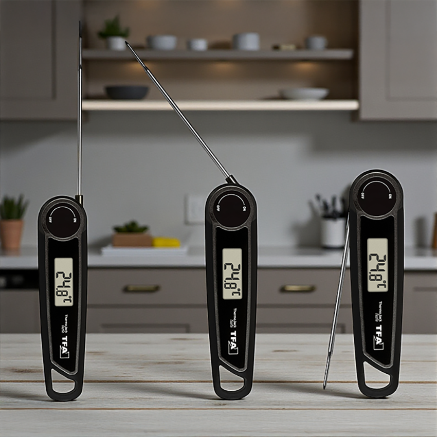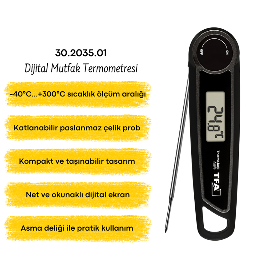 - TFA 30.2035.01, et, tavuk, balık, şekerleme, hamur işleri, süt ürünleri, soslar gibi birçok gıdanın iç sıcaklığını doğrudan ölçmek için kullanılan dijital bir gıda termometresidir.