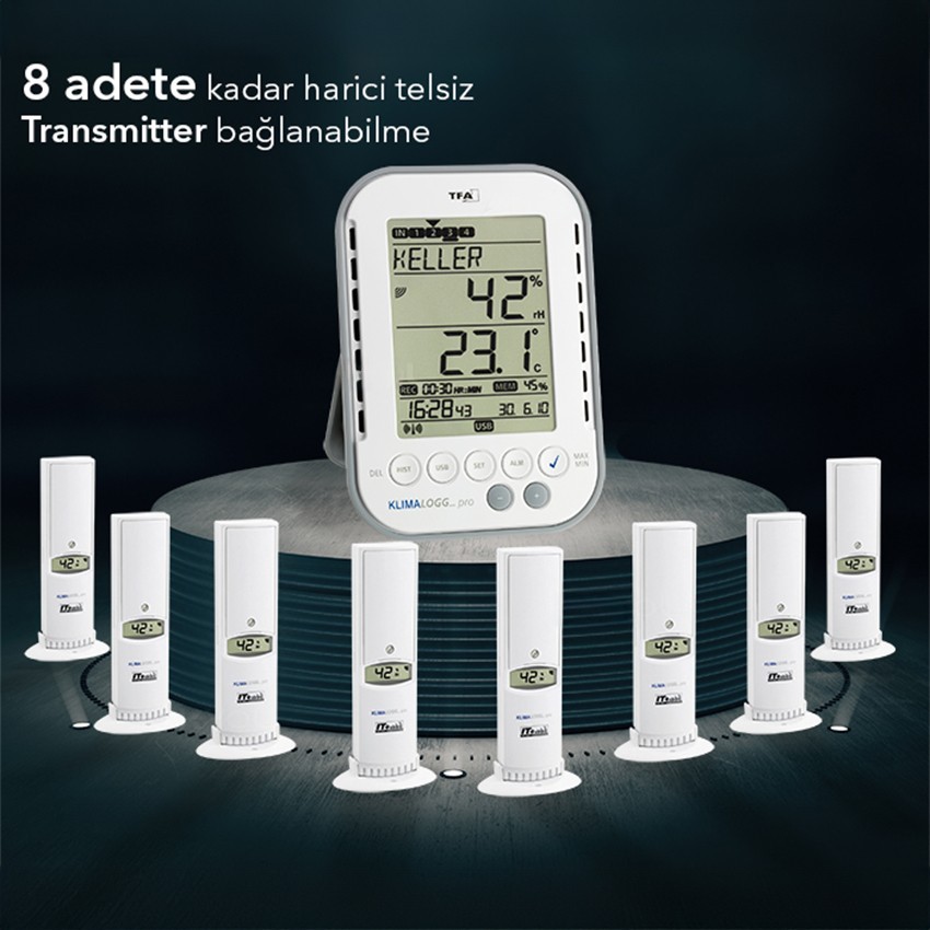 - TFA KLIMALOGG PRO, cihazın kendi sensörleriyle ve opsiyonel satın alınan 8 adede kadar kablosuz vericiyle ölçülen sıcaklık ve nem değerlerini hassas bir şekilde izlemenizi sağlar. Bu sayede uzun süre boyunca önemli iklim verileri kaydedilebilir ve gerekli test raporları oluşturulabilir.