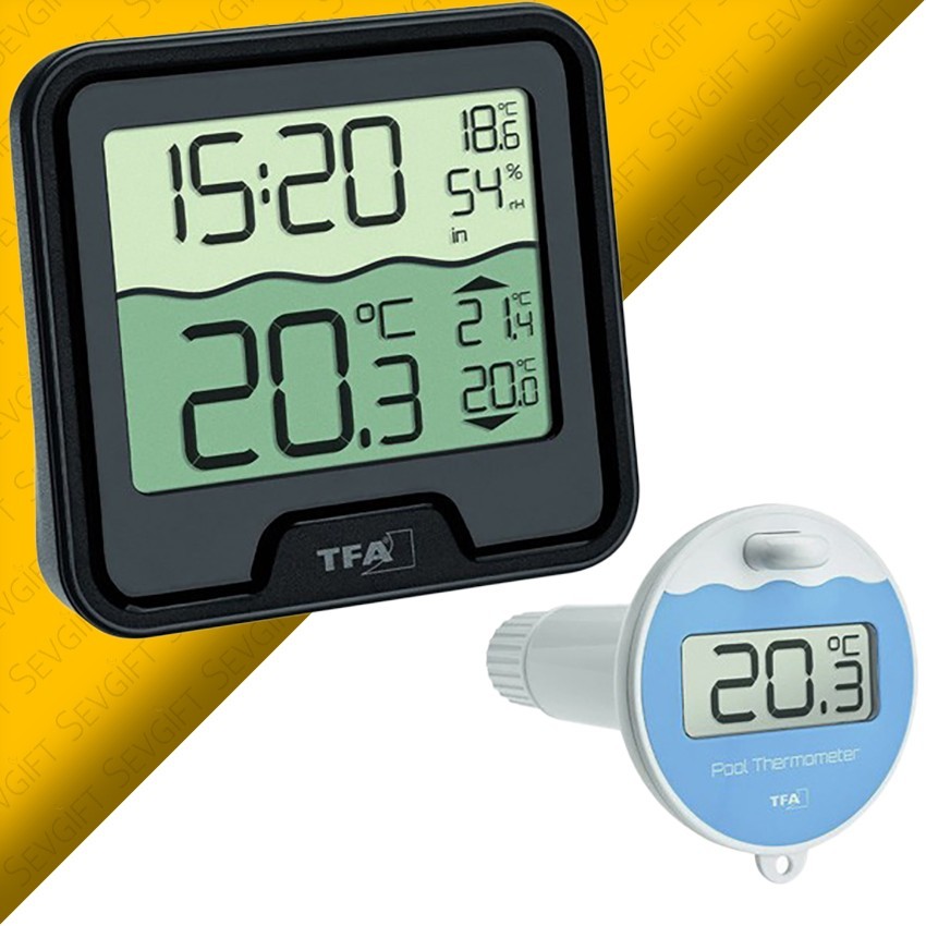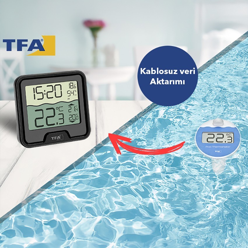 Tfa Dostmann 30.3066.01 havuz termometresi; havuz veya göletlerde kullanım için oldukça kullanışlı bir cihazdır. Cihazın ana ekranından hem bulunduğunuz ortamın nem ve sıcaklığını, hem de wireless (kablosuz) sensörü sayesinde 100 metrelik bir mesafeden havuz suyu sıcaklığını takip edebilirsiniz.