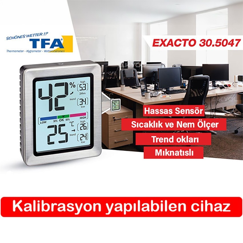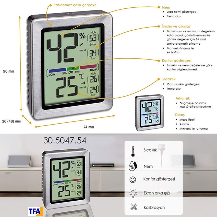 - Tfa 30.5047.54 isimli mekan sıcaklık ve nem ölçer cihazı ısı ve nem sensörü İsviçre üretimi hassas sensörlerdir.