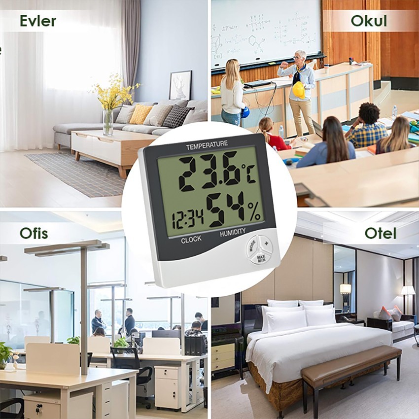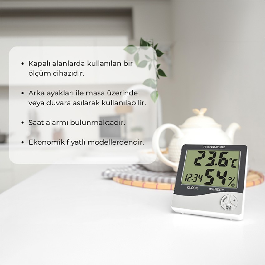 - Bu termohigrometre ayrıca, saat ve tarih gösterme fonksiyonunun yanı sıra bir saat alarm özelliği de sunar. Cihazdaki saat başı sinyali özelliği, her saat başında sizi hatırlatarak zaman yönetiminizi kolaylaştırabilir. Bu özellikler, özellikle ev ve ofis gibi ortamlarda, yaşam kalitesini artırmak için oldukça faydalıdır.