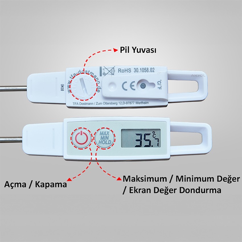 - TFA çubuk termometre 1 adet LR44 pil ile çalışmaktadır.