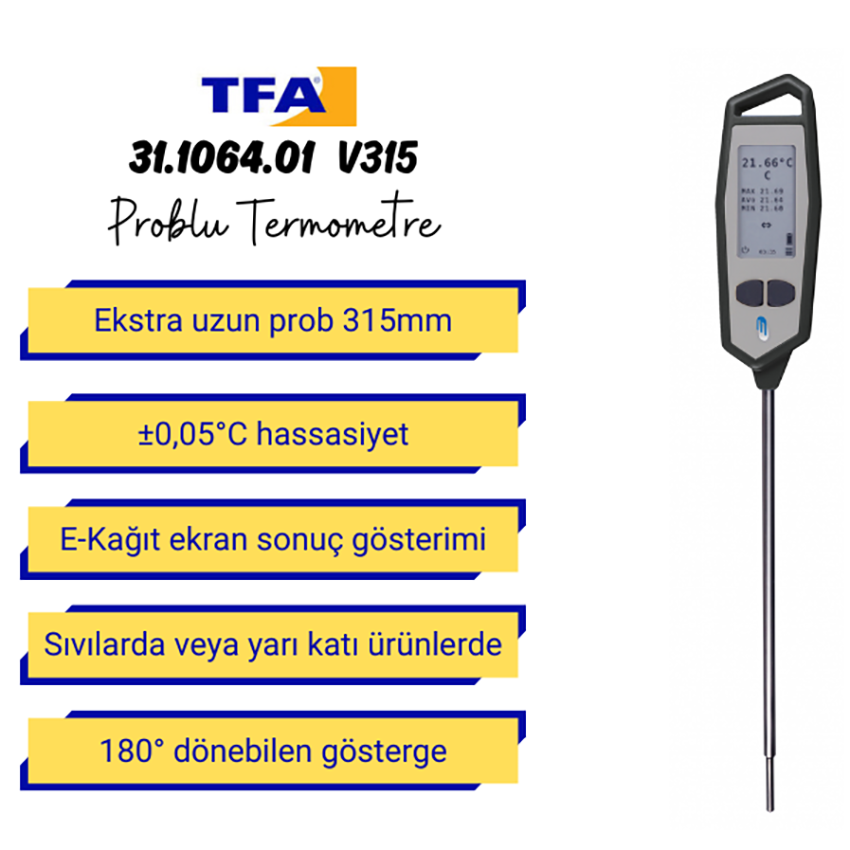 TFA 31.1064.01 problu termometre; 315 mm gibi oldukça ucuz bir ölçüm probuna sahip, ±0.05 °C gibi çok yüksek bir hassasiyet ile sıcaklık ölçümü yapabilen laboratuvar termometresidir.