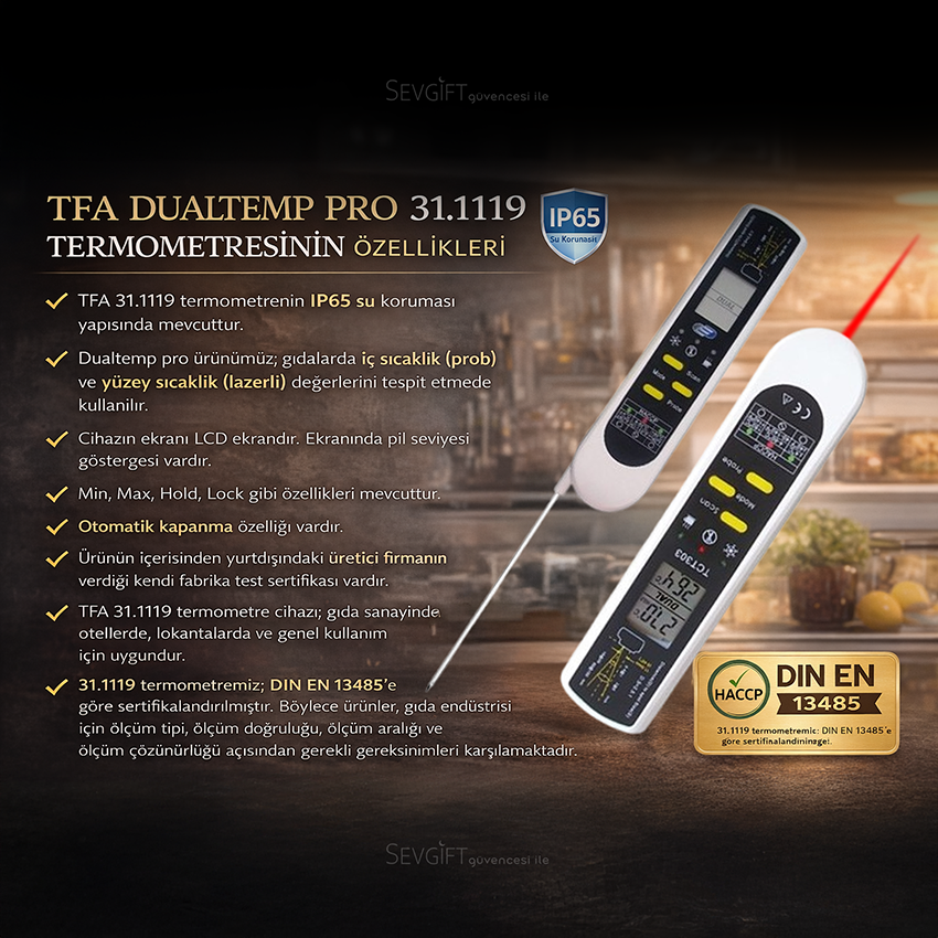 TFA 31.1119 'Dualtemp Pro' termometre; bünyesinde bulunan hem daldırma tipi probuyla, hem de infrared termometresiyle temaslı veya temassız sıcaklık ölçümü yapabilmektedir.
