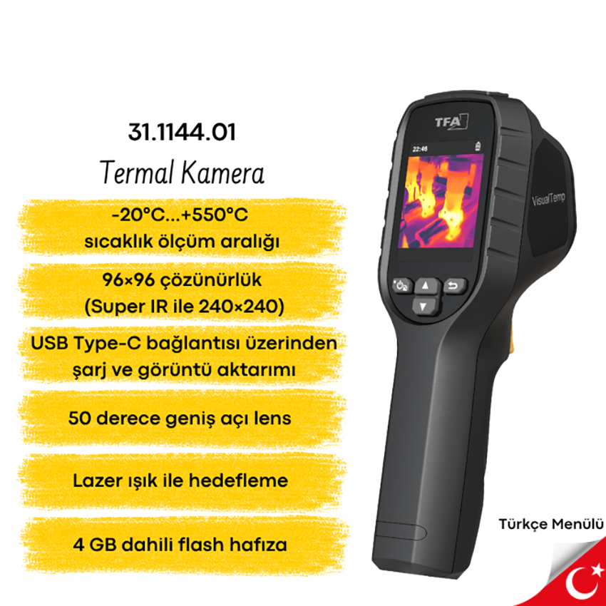 - TFA 31.1144.01 'VisualTemp' ekonomik seri termal kamera, kullanıcı tarafından ayarlanabilen sıcaklık alarm fonksiyonu sayesinde belirlenen eşik değer aşıldığında hızlı uyarı vererek kritik sıcaklık noktalarının daha kolay tespit edilmesine yardımcı olur.
