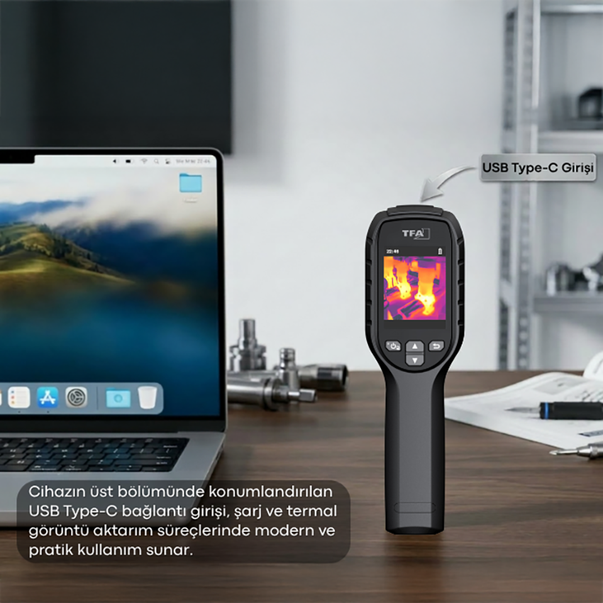 - TFA 31.1144.01, USB Type-C bağlantısı üzerinden hem şarj hem de görüntü aktarımı desteği sunar; kutu içeriğinde yer alan USB kablo ile cihazın bilgisayara bağlanması, veri aktarımı ve günlük kullanım süreci daha pratik hale gelir.