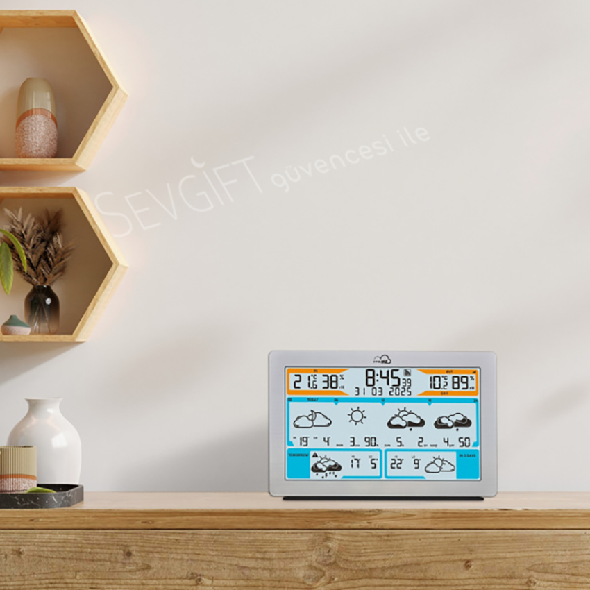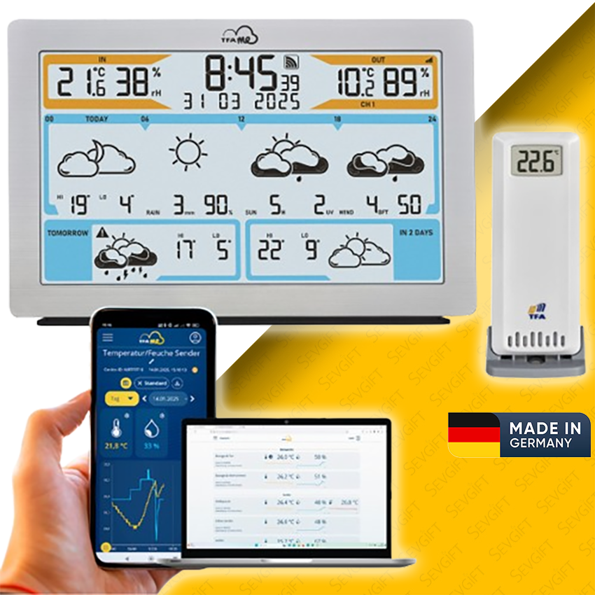TFA 35.8100.54 WiFi Hava Tahminli Kablosuz Hava Durumu İstasyonu, WiFi bağlantısı ile 3-6 günlük profesyonel hava tahmini sunan, iç ve dış ortam sıcaklık-nem takibi yapabilen gelişmiş bir hava istasyonudur. 40’tan fazla hava durumu simgesi, yağış ihtimali, UV indeksi, rüzgar bilgileri, aydınlatmalı ekranı ve TFA.me portal üzerinden online veri izleme desteği ile ev ve ofis kullanımı için kapsamlı ve modern bir hava takip çözümü sunar.