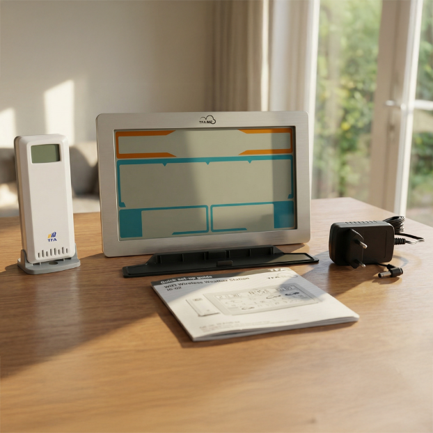 - Ürün kutusundan ana cihaz, güç adaptörü, 1 adet dış ortam sıcaklık ve nem sensörü (ID-A0) ile hızlı başlangıç kılavuzu çıkmaktadır. Ana cihaz için gerekli 3 adet AA yedek pil ve sensör için gerekli 2 adet AA pil kutuya dahil değildir. Ana cihaz, normal kullanımda güç adaptörü ile çalışacak şekilde tasarlanmıştır; yalnızca pil ile kullanımda temel sıcaklık ve nem ölçüm fonksiyonları devam etse de WiFi bağlantısı, TFA.me portal erişimi ve online veri özellikleri kullanılamaz.