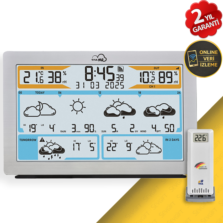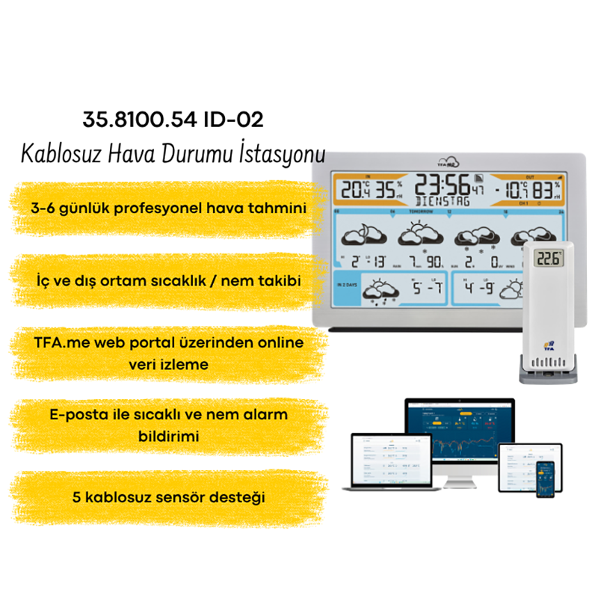 TFA 35.8100.54 WiFi Hava Tahminli Kablosuz Hava Durumu İstasyonu, WiFi bağlantısı ile 3-6 günlük profesyonel hava tahmini sunan, iç ve dış ortam sıcaklık-nem takibi yapabilen gelişmiş bir hava istasyonudur. 40’tan fazla hava durumu simgesi, yağış ihtimali, UV indeksi, rüzgar bilgileri, aydınlatmalı ekranı ve TFA.me portal üzerinden online veri izleme desteği ile ev ve ofis kullanımı için kapsamlı ve modern bir hava takip çözümü sunar.
