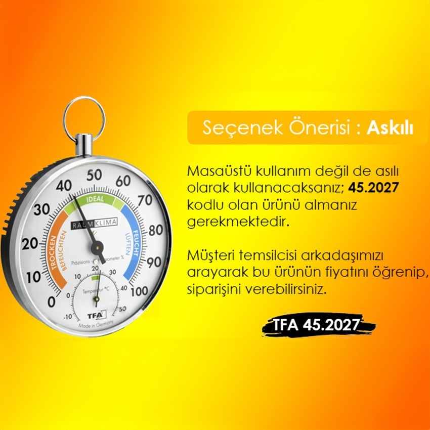 TFA 45.2033 RaumKlima ibreli sıcaklık ve nem ölçer; beyaz kadran üzerine renklendirilmiş konfor işaretleri bulunan, çok hassas bir şekilde sıcaklık ve nemi ölçebilen, oldukça şık bir mekanik termometre ve higrometredir.