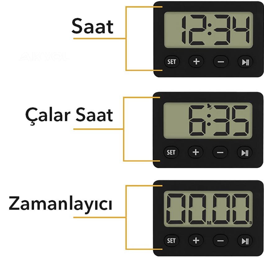 - Bu mini dijital zamanlayıcı cihaz ile saati görebilir, çalar saat kurabilir ve ileri geri sayım işlemlerini yapabilirsiniz.