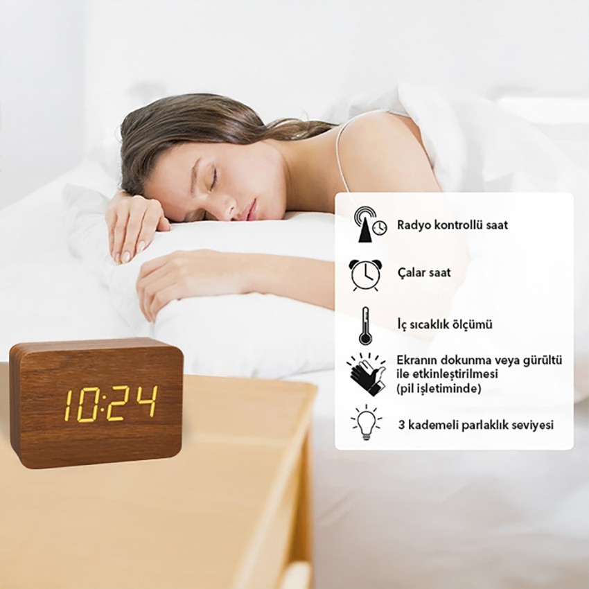 - "UP" butonu ile ahşap saatte hangi bilginin (saat, tarih ve derece gibi) gösterileceğini ayarlayabilirsiniz.