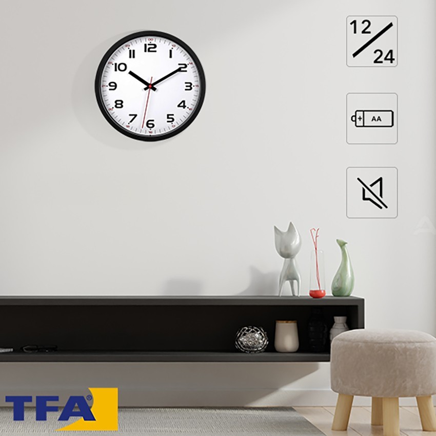 - TFA 60.3050.01 sessiz analog duvar saati 1 adet AA pil ile birlikte çalışmaktadır.