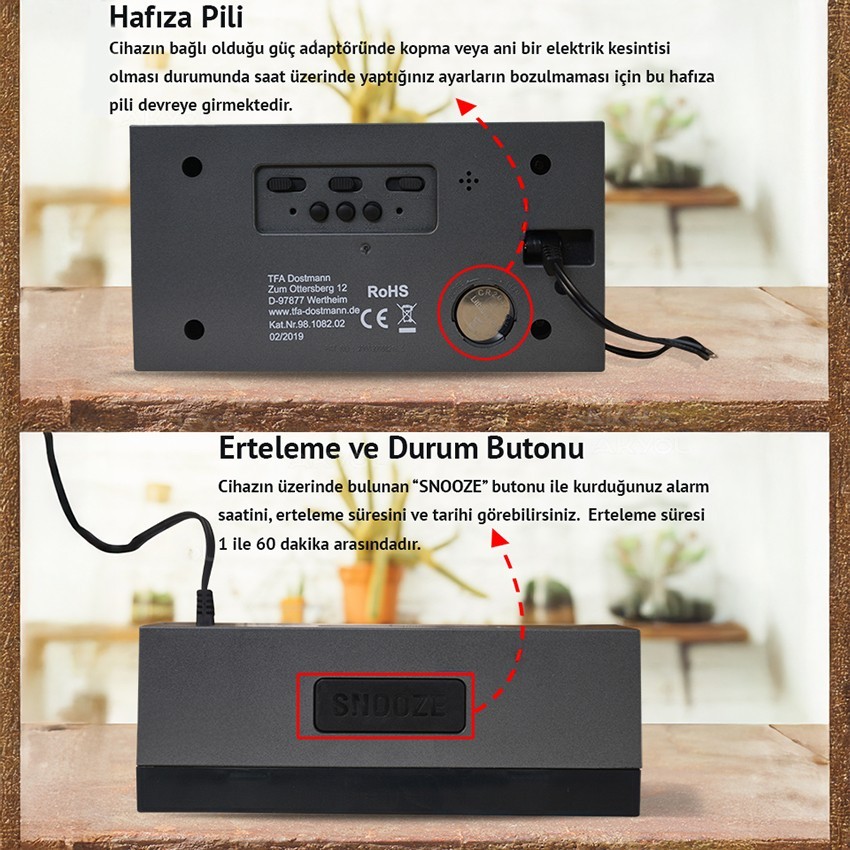 - TFA 98.1082.02 LED ışıklı çalar saat adaptör ile çalışmaktadır. Aynı zamanda bu cihaz hafıza piline sahiptir.
