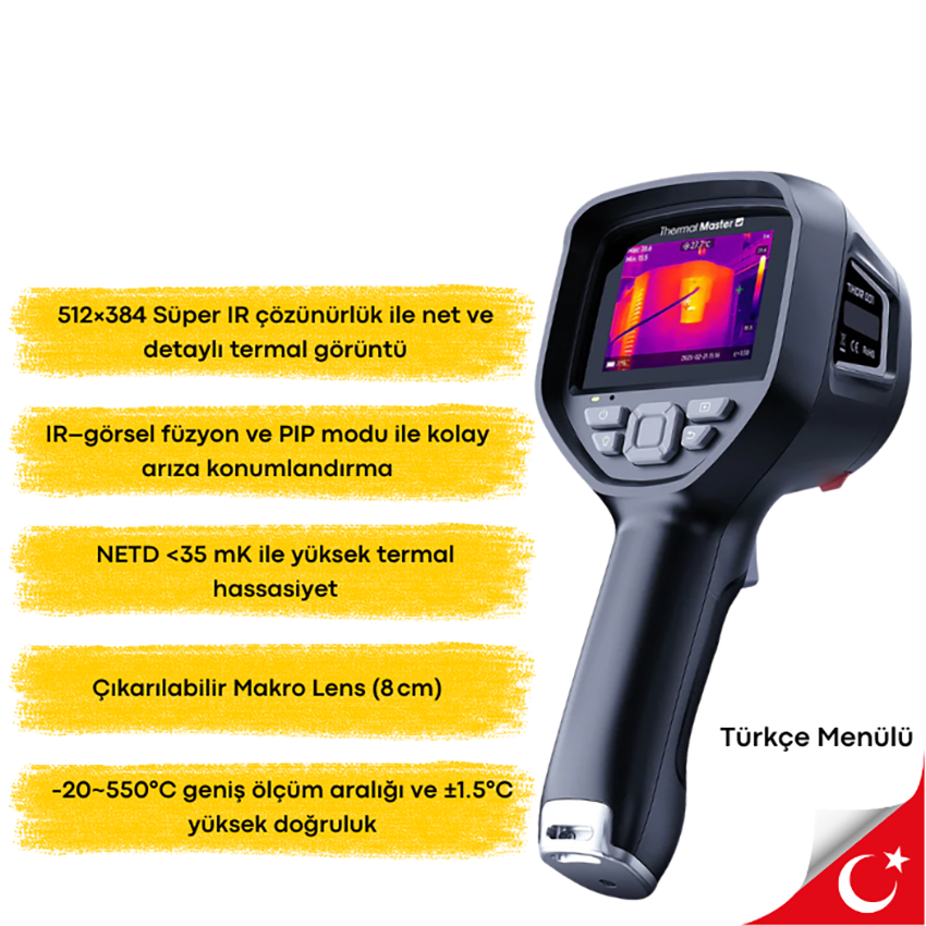 - Thor001 termal görüntüleyici, 512×384 süper kızılötesi çözünürlüğü ve 256×192 IR sensörü ile yüksek detay seviyesinde termal görüntü üretir, elektrik ve mekanik arızaların tespitini kolaylaştırır.