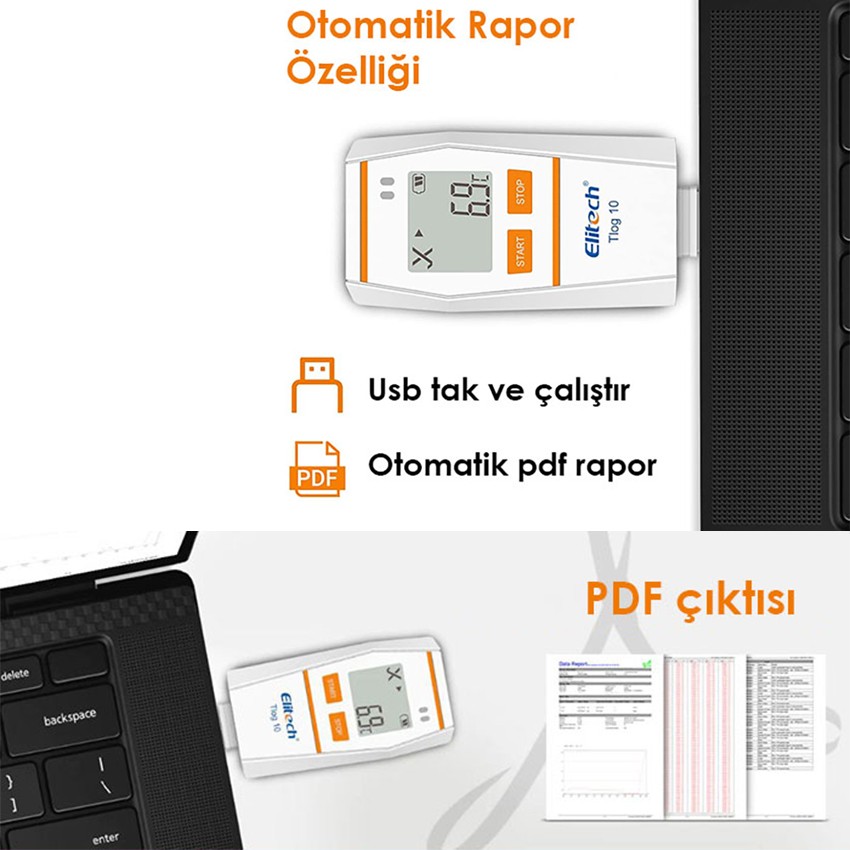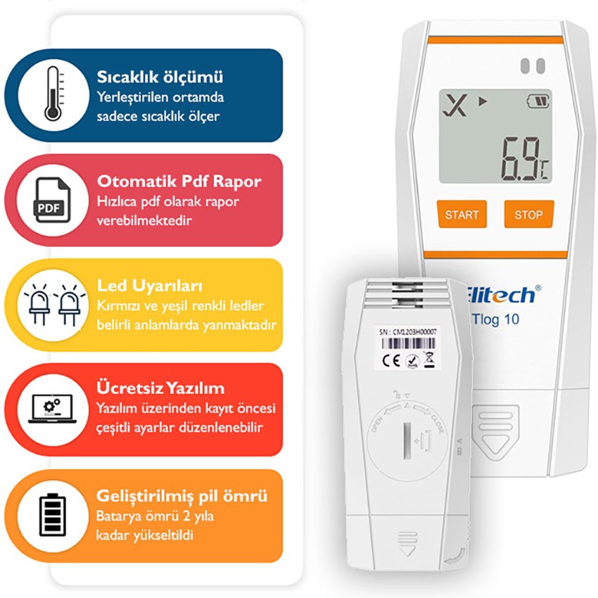 Elitech Tlog 10 serisi veri kaydedici datalogger cihazı, soğutmalı konteynerler, kamyonlar, soğutucu taşıma çantaları, soğutma dolapları, medikal ilaç dolapları, dondurucular ve laboratuvarlar gibi depolama ve soğuk zincir lojistiğinin her aşamasında yaygın olarak kullanılan bir sıcaklık kayıt cihazıdır. Cihaz, bulunduğu ortamın sıcaklık değerlerini hassas bir şekilde ölçer ve kaydeder, böylece sıcaklık kontrolü gereken tüm süreçlerde güvenli bir takip sağlar.