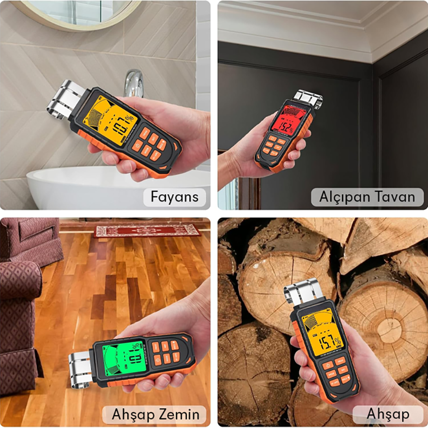 Ahşap kirişler, zeminler, mobilyalar, kaplamalar ve gazbeton gibi düşük yoğunluklu ve suyu kolay emen malzemeler için optimize edilmiştir. Ahşap içindeki nem oranını hassas biçimde ölçerek küf, çürüme ve deformasyon risklerinin erken tespitine yardımcı olur.
