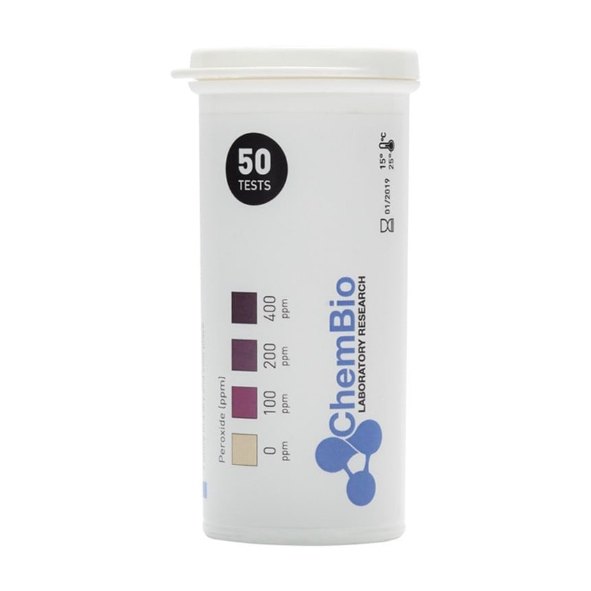 Yüksek aralıklı peroksit test şeridi ile hidrojen peroksit (H₂O₂) seviyesini 0-400 ppm aralığında hızlı ve pratik şekilde ölçün. Dezenfektan ve endüstriyel kullanım için ideal.
