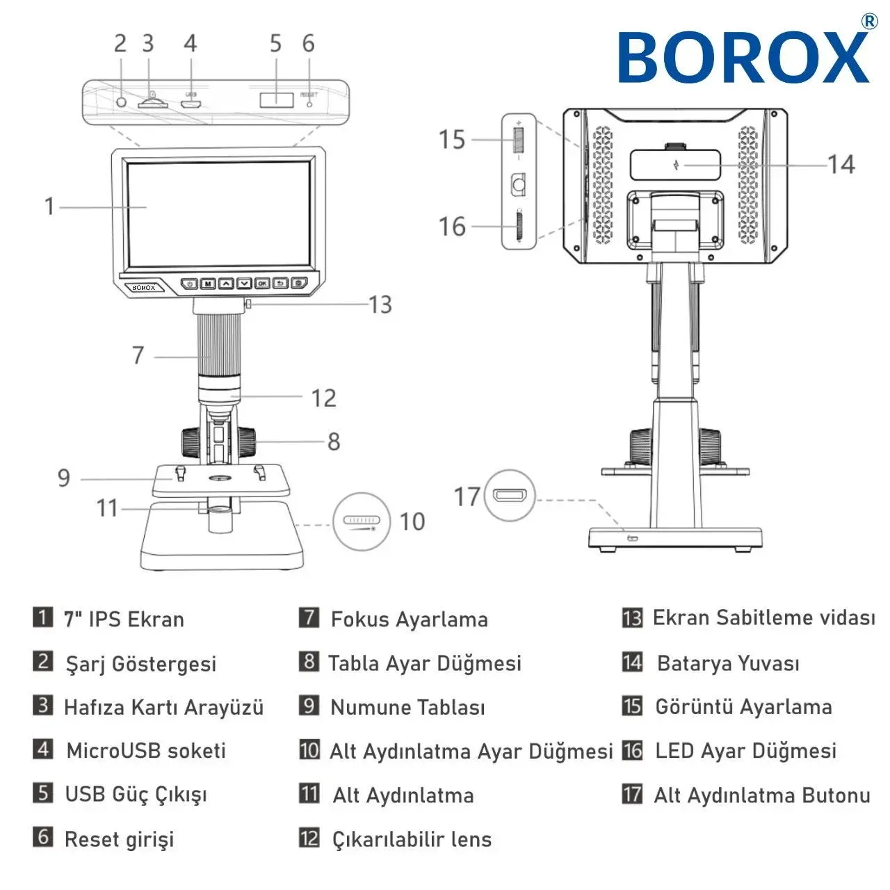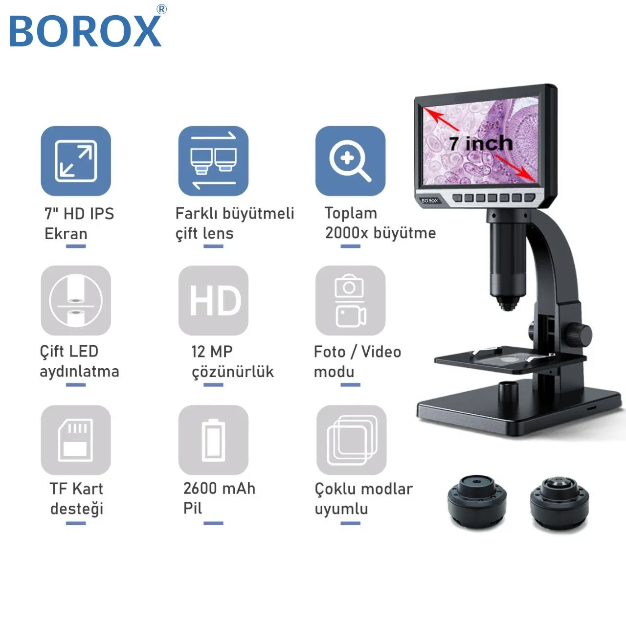 BOROXlab Dijital Mikroskop Çift Lens 2000x büyütme 7" 12 MP Yüksek çözünürlüklü IPS geniş ekranlı mikroskop. Dijital mikroskop 2000x büyütme ile farklı türlerdeki numuneleri görüntüleyebilme imkanı. Hassas ayara imkan veren özel metal sprey boyalı fokus tüpü ile 500x ve 2000x büyütme kapasitesi. Mikrobiyal gözlemden devre kartı bakım ve onarımına kadar uzanan geniş kullanım alanı.