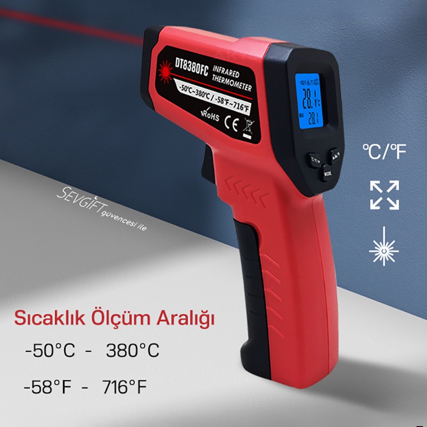 DT8380FC kızılötesi lazerli termometre; ergonomik tasarıma sahip, genel kullanıma hitap eden, -50°C ile +380°C dereceye kadar ölçüm yapabilen tek lazerli sıcaklık ölçüm cihazıdır.
