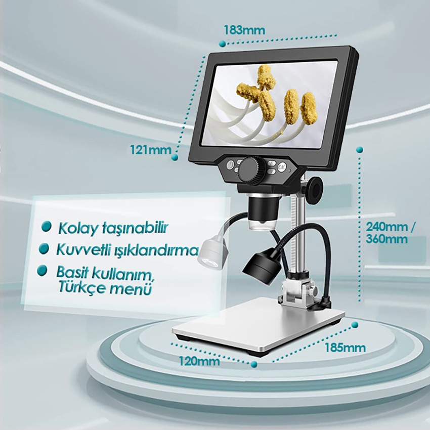 1200X büyütmeli dijital mikroskop ile detayları net şekilde inceleyin. 7 inç HD ekran, 8 LED aydınlatma ve fotoğraf/video kaydı ile profesyonel ve hobi kullanıma uygundur.