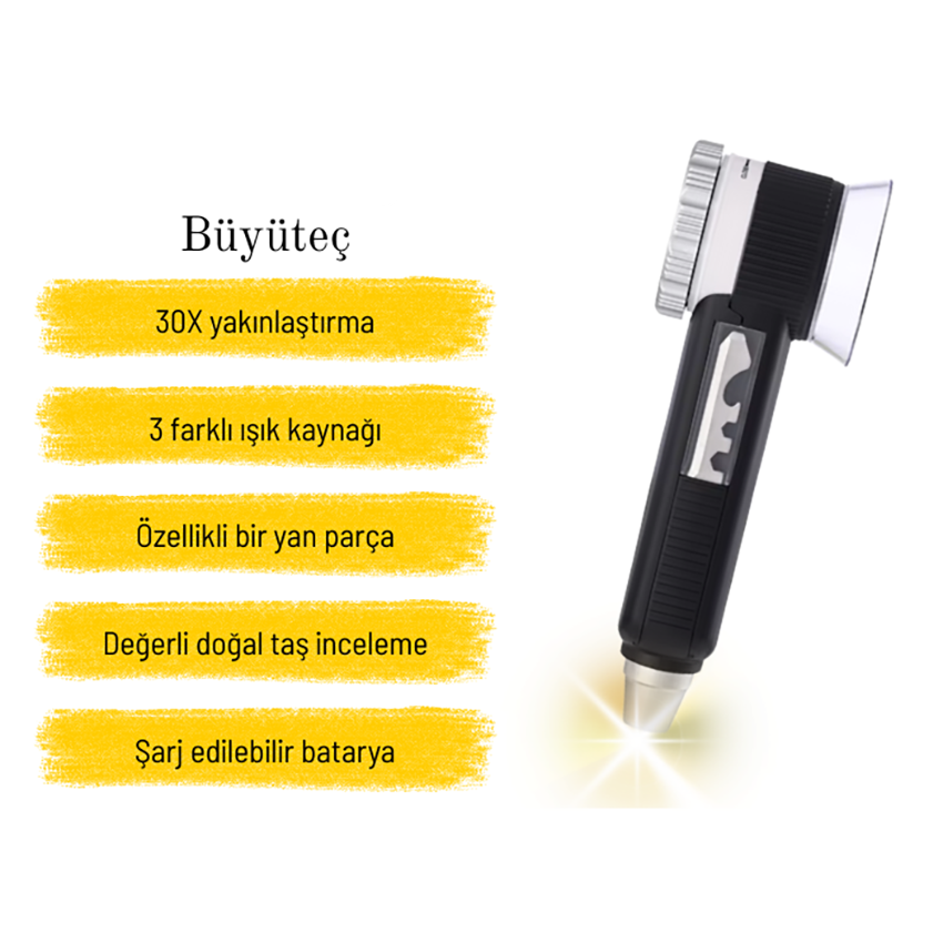 30X el büyüteci; yüksek çözünürlüklü çift katmanlı lens, beyaz LED, UV mor ışık ve sarı yardımcı ışık ile detaylı inceleme sağlar. USB şarjlı lityum pili sayesinde mücevher, koleksiyon ve küçük parçaların incelenmesi için idealdir.