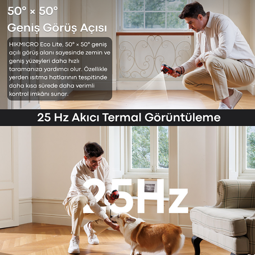 - HIKMICRO Eco Lite 25 Hz görüntü yenileme hızı sayesinde hareketli taramalarda daha akıcı görüntü sunar; duvar, pano, tesisat veya mekanik ekipman kontrollerinde düşük yenileme hızına sahip modellere göre daha konforlu ve verimli kullanım avantajı sağlar.