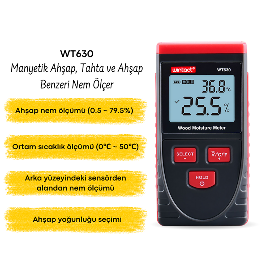 Wintact WT630 manyetik ahşap, tahta ve ahşap benzeri malzemelerde nem oranının hızlı ve pratik şekilde kontrol edilmesi için geliştirilmiş,