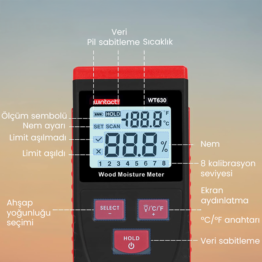 - WT630 modelinde yalnızca nem oranı değil, aynı zamanda ortam sıcaklığı bilgisi de ekranda görüntülenerek kullanıcıya ek veri sağlar. Hold (değer sabitleme) fonksiyonu sayesinde ölçüm sırasında elde edilen değer ekranda sabitlenebilir; bu da kontrol ve karşılaştırma işlemlerini daha kolay hale getirir.