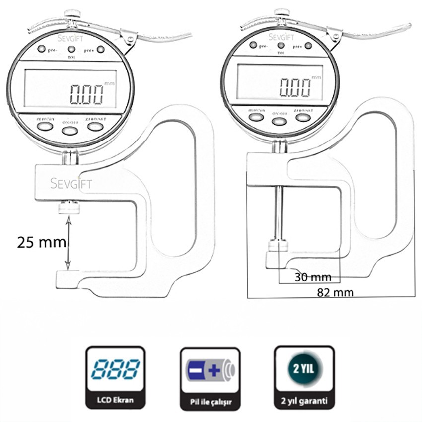 Sevgift 5245-25 kalınlık komparatörü; 0' dan 25 mm' e kadar hassas bir şekilde malzeme kalınlığı ölçmek için tasarlanmış kalınlık komparatörüdür.