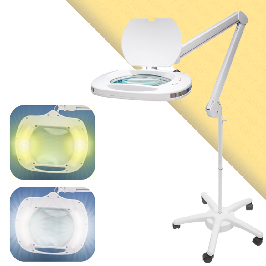 Ayaklı led büyüteç, geniş merceği ve çift renkli (sarı-beyaz) ayarlanabilir led aydınlatması ile net ve konforlu bir görüş sağlar. Beş tekerlekli sağlam ayak yapısı sayesinde çalışma alanında kolayca konumlandırılabilen, uzun ömürlü ve pratik bir büyüteç modelidir.
