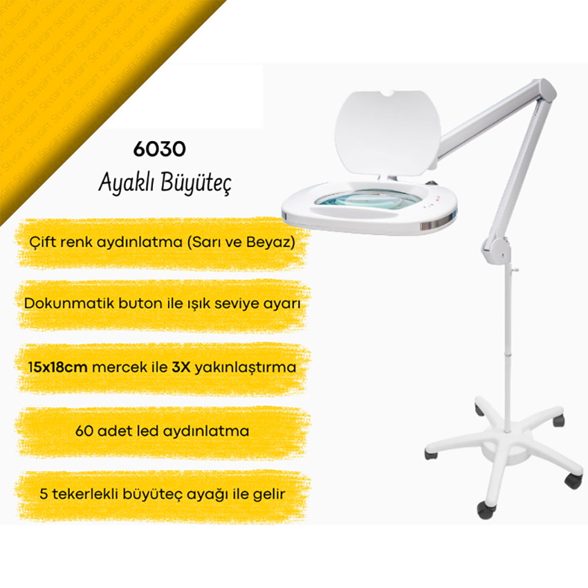 6030 ayaklı led büyüteç, geniş merceği ve çift renkli (sarı-beyaz) ayarlanabilir led aydınlatması ile net ve konforlu bir görüş sağlar.