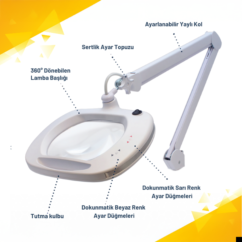 - 5 tekerlekli bu büyüteç lamba, hem dikey hem de yatay konumlandırılabilir. Ayrıca masa bağlantı aparatı ile 360° dönebilen yapısı, kullanıcının istediği açıdan çalışabilmesine imkân verir. Bu özellik, özellikle masa üstü tasarım ve sanat çalışmalarında büyük avantaj sağlar.