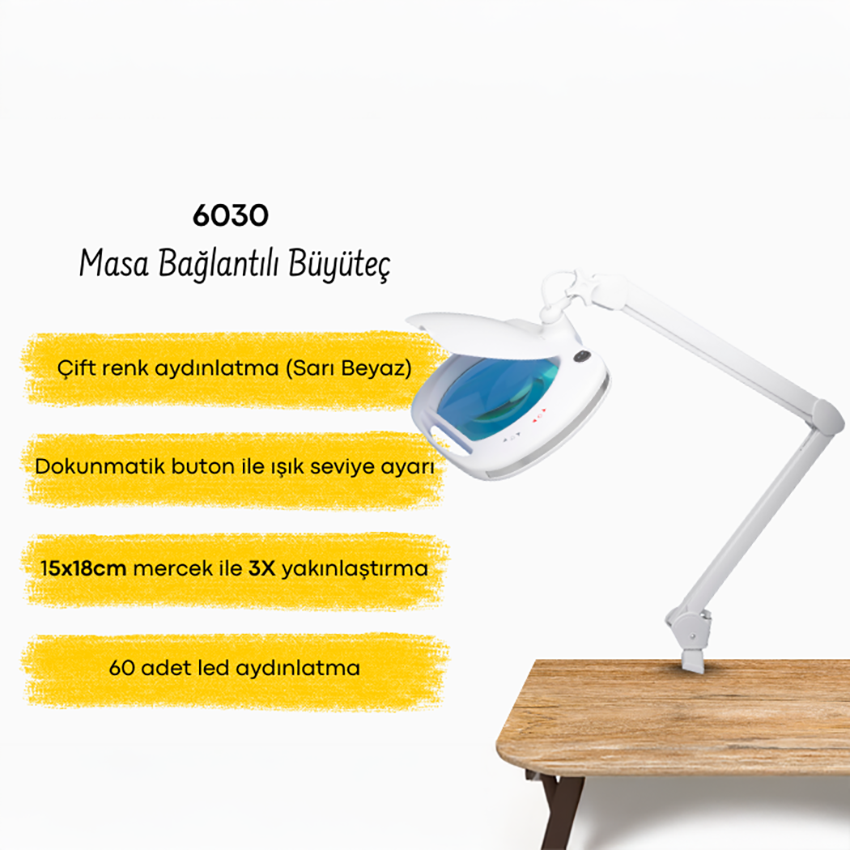 6030 modeli, Loyka markasına ait 15x18cm ölçülerinde geniş mercekli, sarı ve beyaz olmak üzere çift ışık renk seçeneğine sahip, kademeli (dual dimmer) ayarlanabilir led büyüteç lambasıdır.