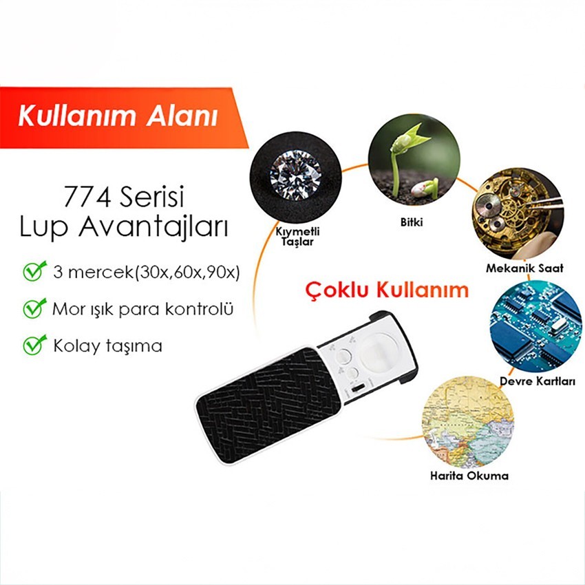 774 serisi büyüteç, 30X, 60X ve 90X büyütme kapasitesine sahip üç ayrı mercek ile donatılmış, elektronik tamir, koleksiyonculuk ve detaylı inceleme gibi alanlarda kullanılabilen ışıklı bir lup büyüteçtir. Hem amatör hem de profesyonel kullanıcılar için uygundur.