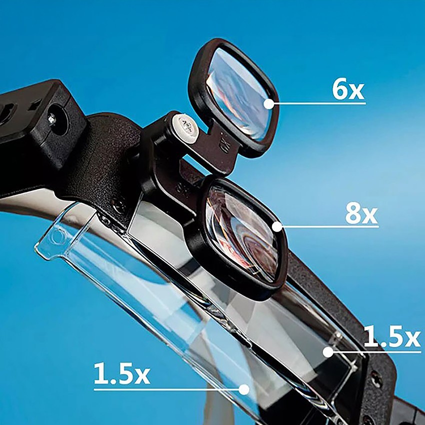 MG81001-G led ışıklı gözlük kafa büyüteci; birbirinden farklı ölçeklerde 5 adet merceğe sahip, saatçilerin, elektronik devre tamiri yapanların, kuyumcuların sıklıkla kullandığı led ışıklı kafa tipi gözlük büyüteçtir.
